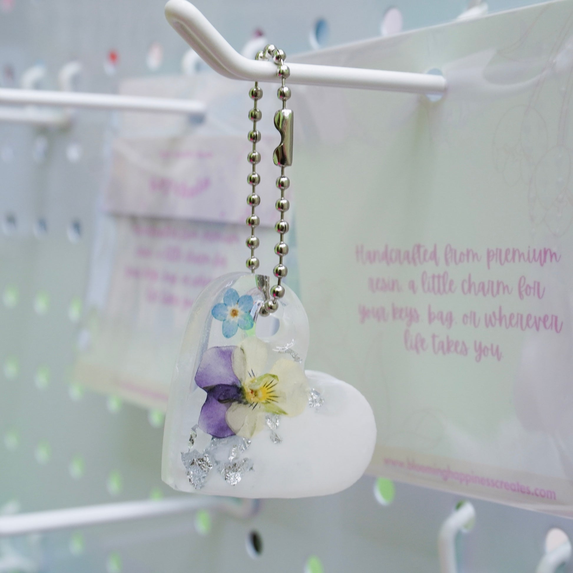 Violet Bloom Heart Resin Keychain – Real Pressed Flowers & Silver Flakes