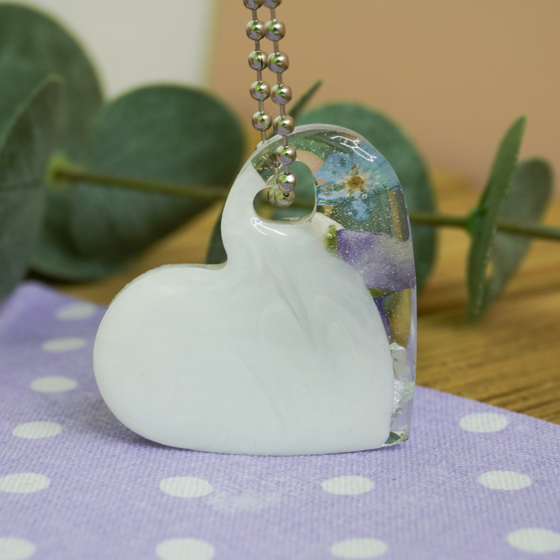 This heart-shaped resin keychain features real dried pressed violet and blue flower, carefully preserved in crystal-clear resin to maintain their natural beauty. The soft White Pearl background enhances the floral details, while shimmering silver flakes add an elegant, light-catching finish.